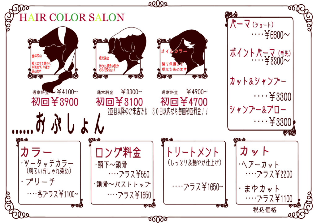 1「髪染舘」ヘアカラー 髪染めメニュー 火曜・木曜・金曜 予約制になります 初回は通常料金より 200円引きになります。 また次回ご予約日が30日以内なら 毎回初回料金になります。 火曜・木曜・金曜 予約制になります ご予約はお電話で 04-2921-5229